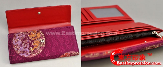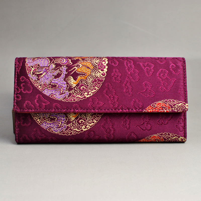 真皮雲錦錢包-紫紅色團花雙龍戲珠