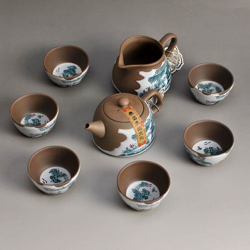 該款茶具設計精巧,陶制黃色蛟龍盤繞在瓷質天青色杯體和壺體之上,瓷的光潔細膩和陶的質樸粗獷相映成趣,整體造型古樸典雅,色彩淡雅可人,有華而不豔,低調奢華之感,極富閒靜的意境和質樸之美。